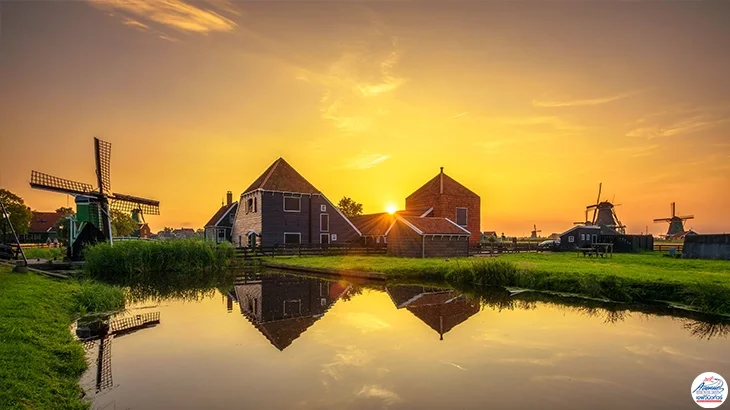 1. หมู่บ้านกังหันลม ซานส์ สคันส์ (Zaanse Schans), เนเธอร์แลนด์ ภาพกังหันลมโบราณริมแม่น้ำ ท่ามกลางทุ่งหญ้าเขียวขจีและบ้านไม้สีน่ารัก ที่นี่จะพาคุณย้อนเวลากลับไปสู่เนเธอร์แลนด์ในศตวรรษที่ 18 พร้อมกลิ่นหอมของชีสและเวิร์กช็อปทำรองเท้าไม้แบบดั้งเดิม