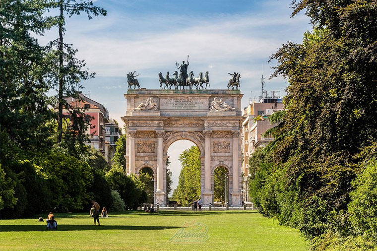 ภายในสวนสาธารณะ Parco Sampione เป็นที่ตั้งของหอคอย Torre Branca ใครอยากชมวิวมุมสูงสามารถใช้บริการได้ ที่บริเวณท้ายสวนจะได้พบกับประตูชัย Porta Sempione ที่มีลักษณะคล้ายกับประตูแห่งการูแซลในกรุงปารีส สร้างขึ้นโดยนโปเลียน เพื่อเป็นประตูจากฝรั่งเศสสู่มิลาน ภายหลังนโปเลียนแพ้สงคราม ประตูแห่งนี้ถูกทิ้งร้างและมีการสร้างต่อจนแล้วเสร็จในเวลาต่อมา ชาวมิลานเรียกประตูชัยแห่งนี้ว่า ประตูชัยแห่งสันติภาพ เป็นอีกหนึ่งแลนด์มาร์กของมิลานที่ควรมาเห็นด้วยตาตัวเอง