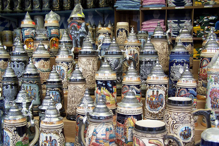 แก้วเบียร์ของเยอรมันจะมีลวดลายที่เป็นเอกลักษณ์ มีทั้งวัสดุที่ทำจากเงิน ไม้แกะสลักและแก้วเนื้อหนาอย่างดี รูปทรงใหญ่สะใจคอดื่ม ไม่ต้องเติมบ่อย ๆ ทีละนิด ๆ เติมรอบเดียวอยู่ยาว ๆ ไปเลย มีความแข็งแรง คงทน สามารถขนกลับไทยได้ไม่บุบสลายแน่นอน เรียกได้ว่าเป็นของฝากสุดฮิตที่ต้องมีติดมือกลับกันมาด้วยค่า